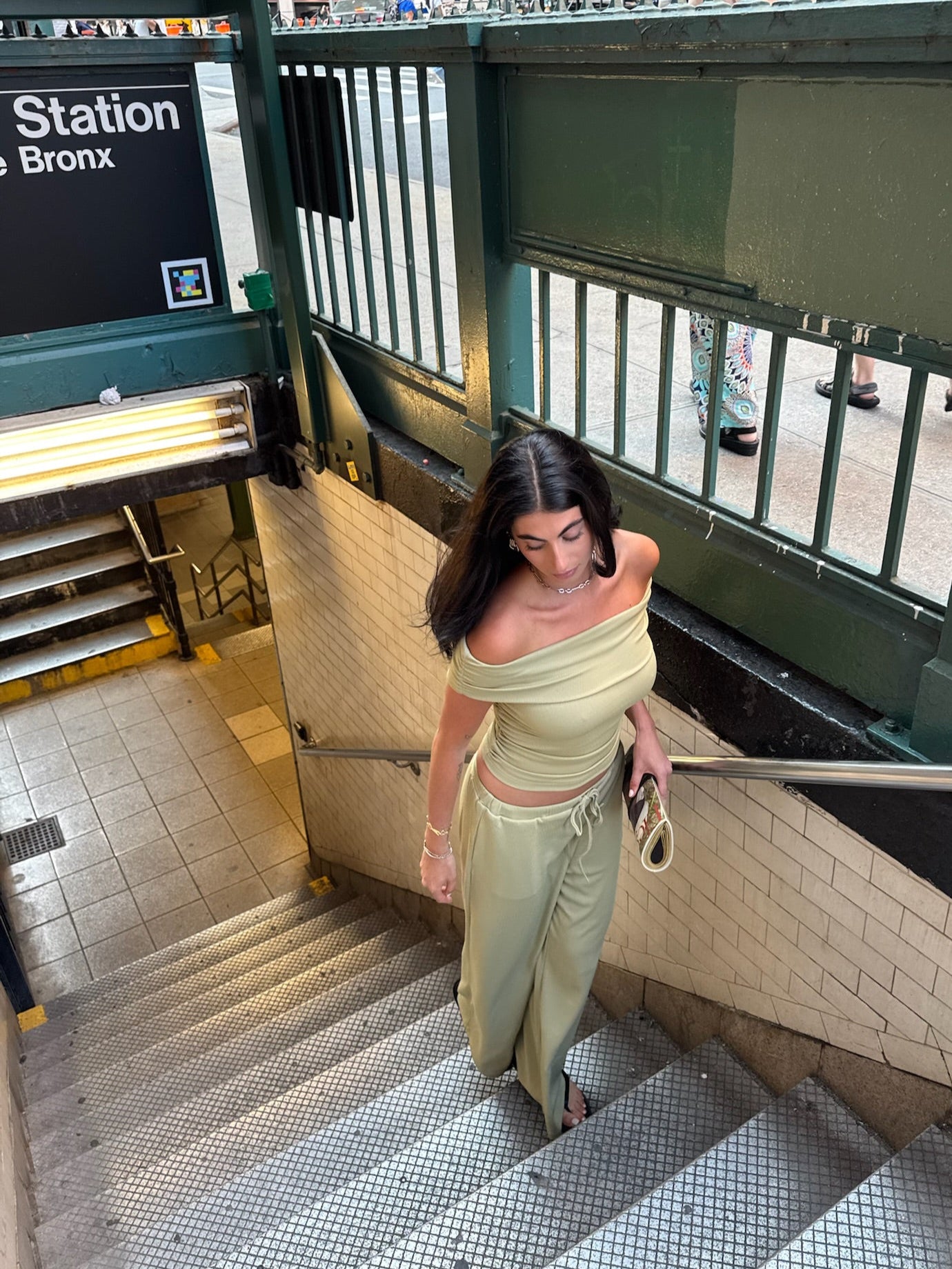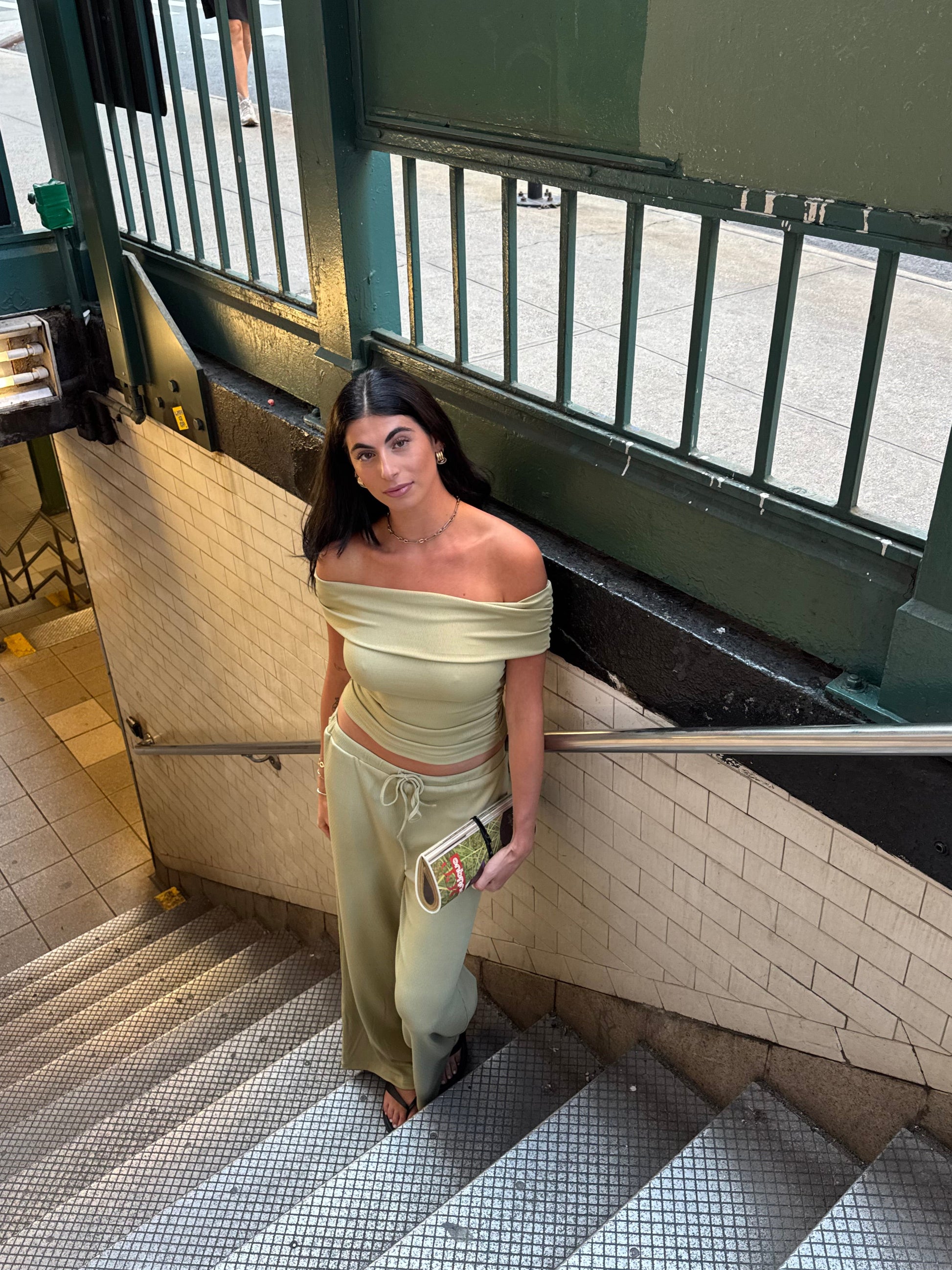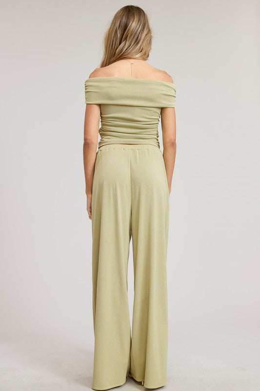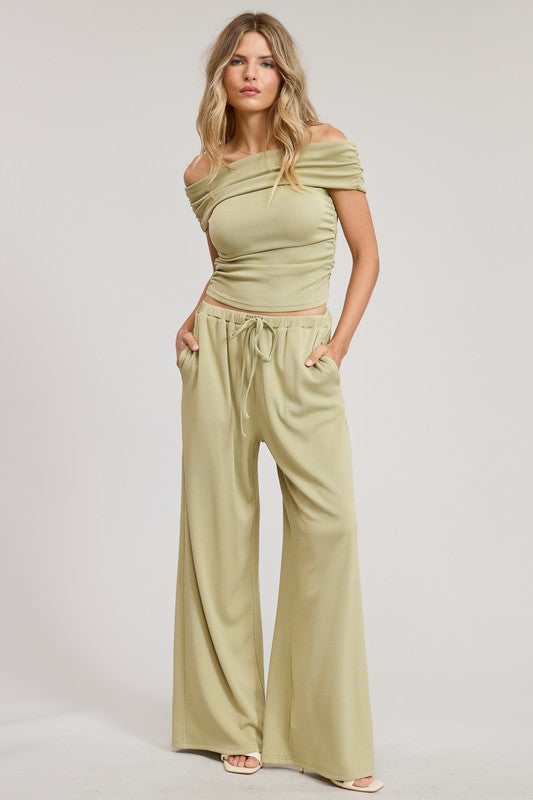 matching set with off shoulder top and drawstring pants.