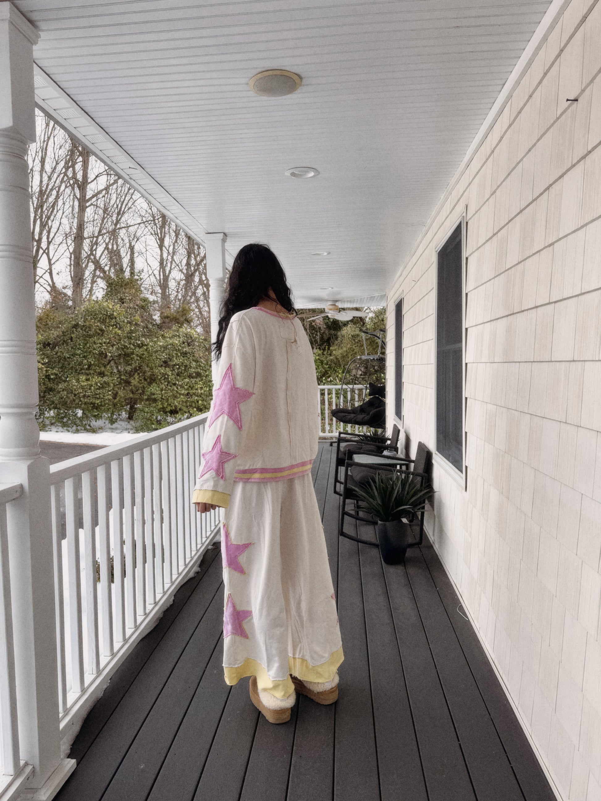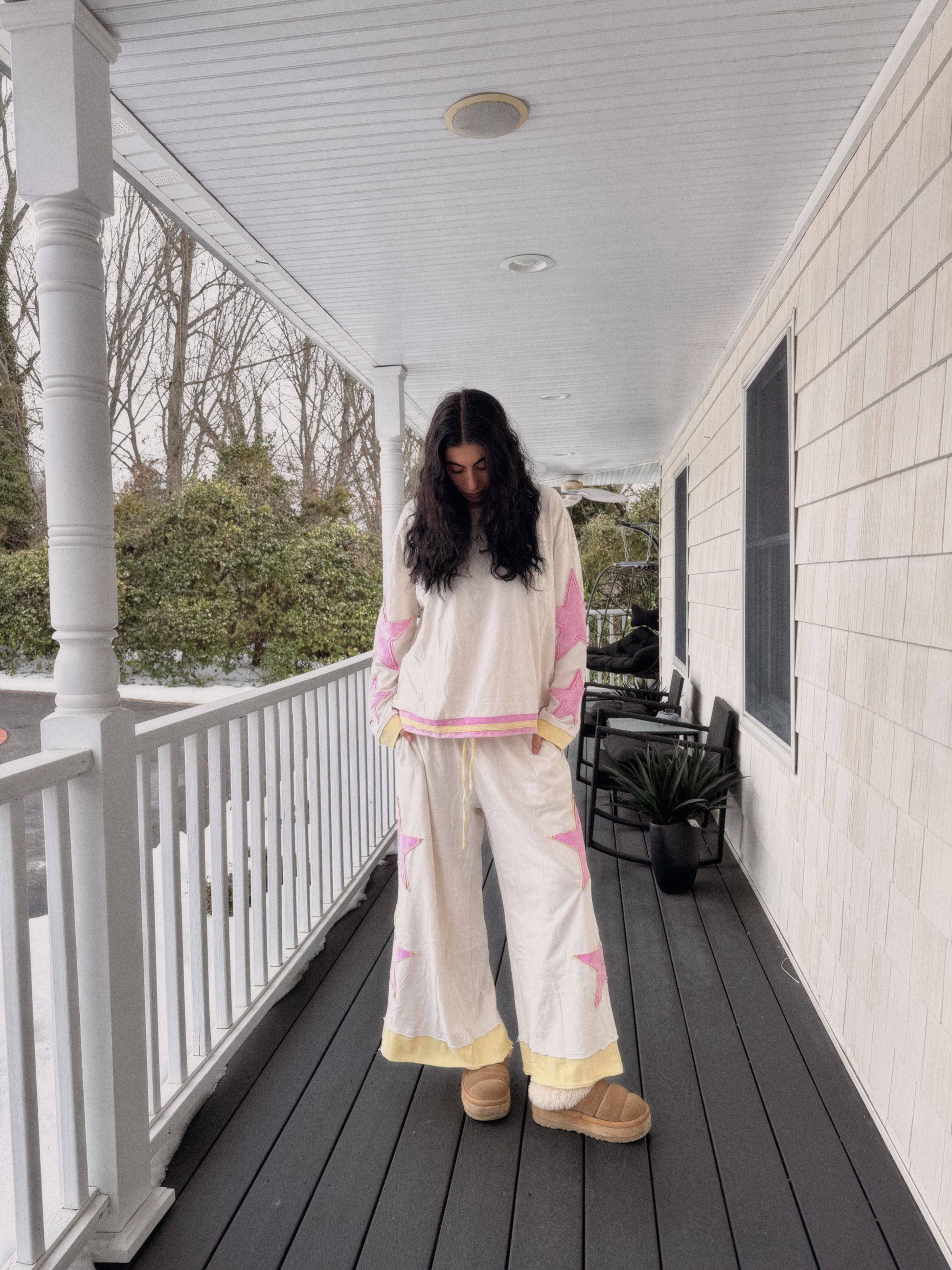chic meets comfort. the stella star bottoms feature a relaxed fit, soft feel, and statement star detail for that elevated lounge vibe.